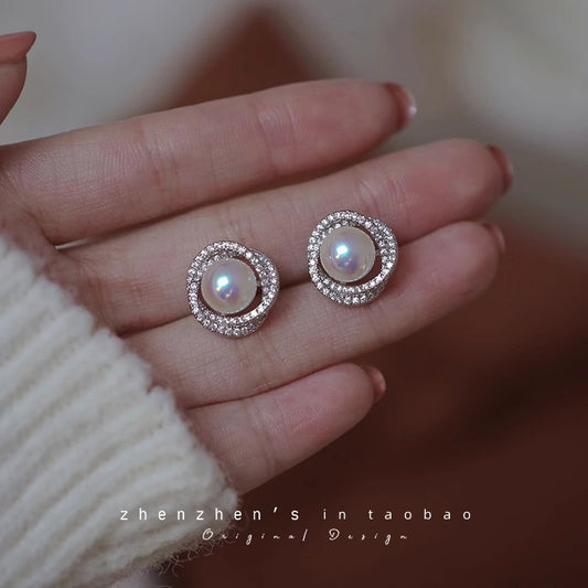 Elegant atmosphere of natural strong light freshwater 6A flat round pearl earrings temperament senior sense of light luxury 925 silver earrings