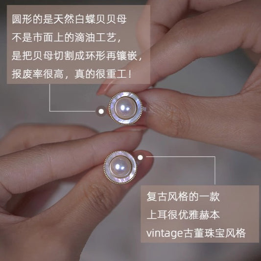 Sun and Moon Wheel丨Designed retro sense of natural white butterfly shell round 6A strong light natural flat round pearl silver pin earrings