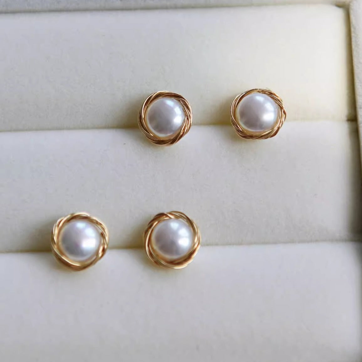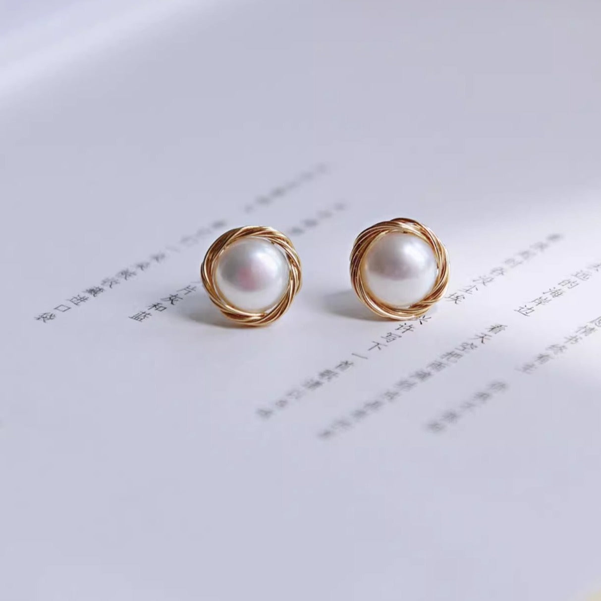 Pure hand-wound natural strong light freshwater pearl retro bird's nest silver pin earrings 14k gold-plated button earrings