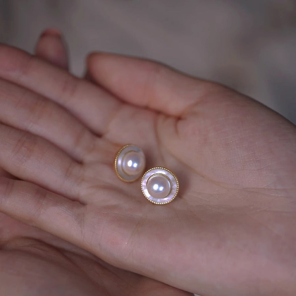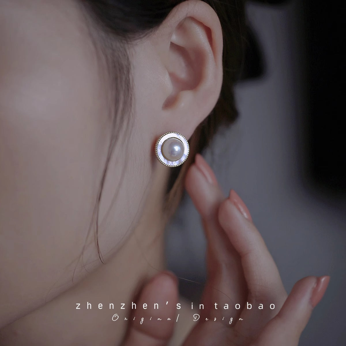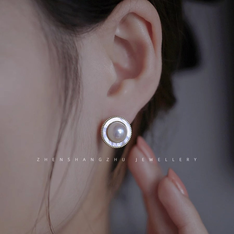 Sun and Moon Wheel丨Designed retro sense of natural white butterfly shell round 6A strong light natural flat round pearl silver pin earrings